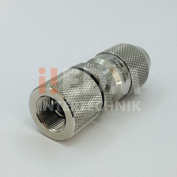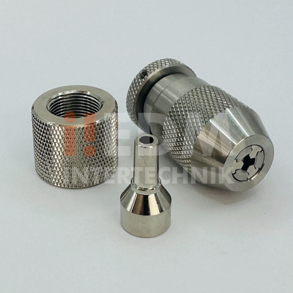 Mandril de precisão completo, em inox, para máquinas de furo rápido para microtubos de Ø0.10 a Ø3.00 mm com pino centralizador, rosca para montagem e alojamento para vedação.