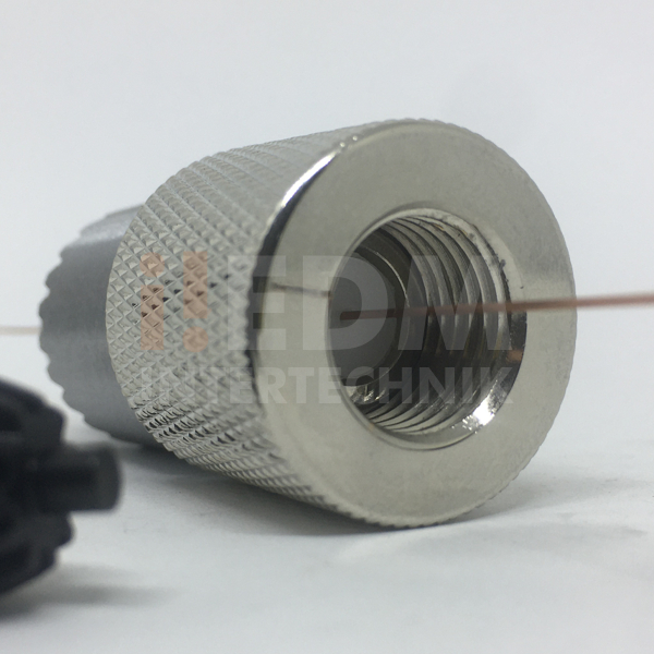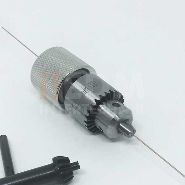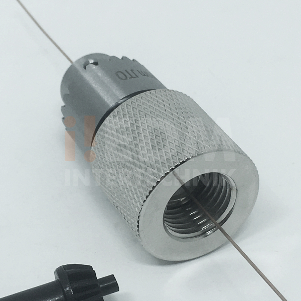 Mandril com chave para máquinas de furo rápido para microtubos de Ø0.15 a Ø4.00 mm com pino centralizador, rosca para montagem e alojamento para vedação.